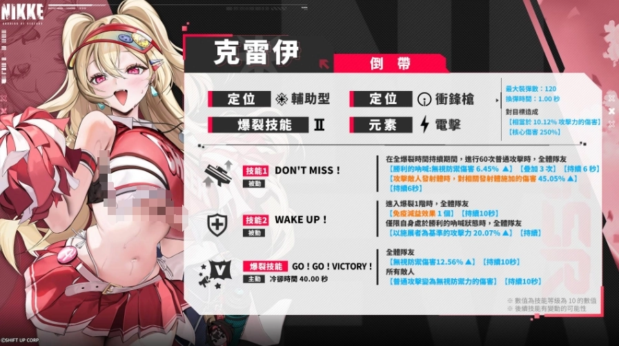 在武器方面,克雷伊配备的是冲锋枪。这把冲锋枪的最大装弹量为120发,换弹时间仅有1.00秒。如此卓越的性能,让她在战斗中能够维持不间断的火力输出。每次射击,都能对目标造成相当于自身10.12%攻击力的伤害,而核心伤害更是高达250%。对于辅助型角色而言,这样的普攻伤害表现已然十分出色。克雷伊的技能更是别具一格,技能1是名为DON'T MISS的被动技能。在全爆裂时间持续阶段,当她完成60次普通攻击,便会触发额外效果。