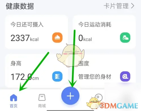 1. 开启轻牛健康软件,于首页点击下方正中间的加号图标,具体位置参照图示。