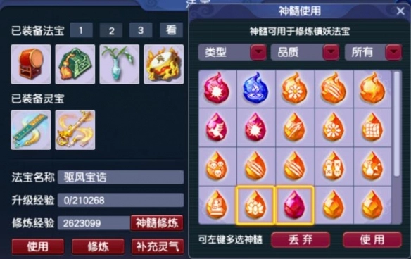 2、玩家能够使用部分神髓来修炼镇妖法宝。斩妖任务对于装备的要求并不严苛,主要依靠获神塔养成来降低任务难度。