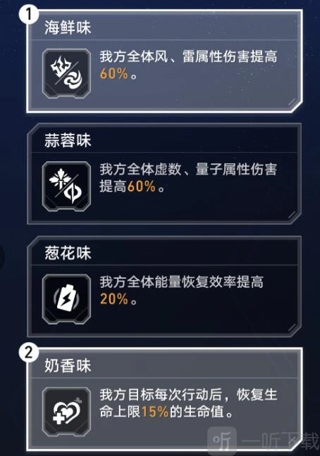 解析:海鲜味与蒜蓉味,可依据队伍中输出角色的属性来推荐,即根据C位挑选与之对应的属性伤害提升的气味。要是奶量不足,就选择奶香味以增强回复能力;若奶量充足,便选择能量回复效率,如此能更迅速地造成伤害。