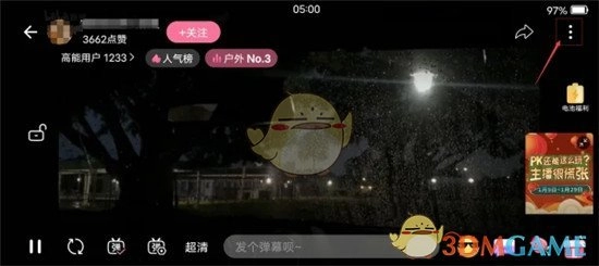 2、开启哔哩哔哩APP,找到想要投屏的直播并播放,切换至全屏观看模式后,轻点右上角的三个点。