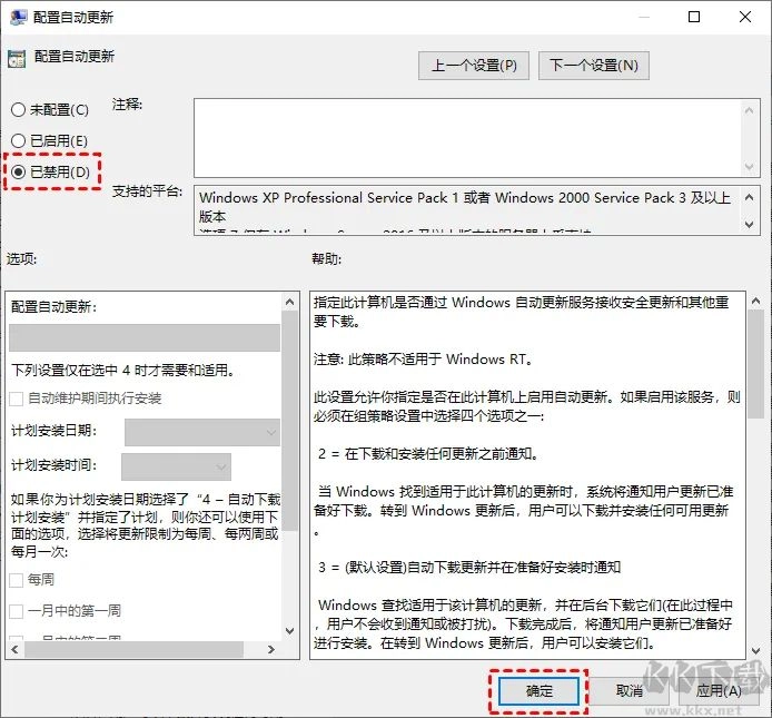 3. 在弹出的“配置自动更新”窗口中,选择“已禁用”,再单击“确定”。