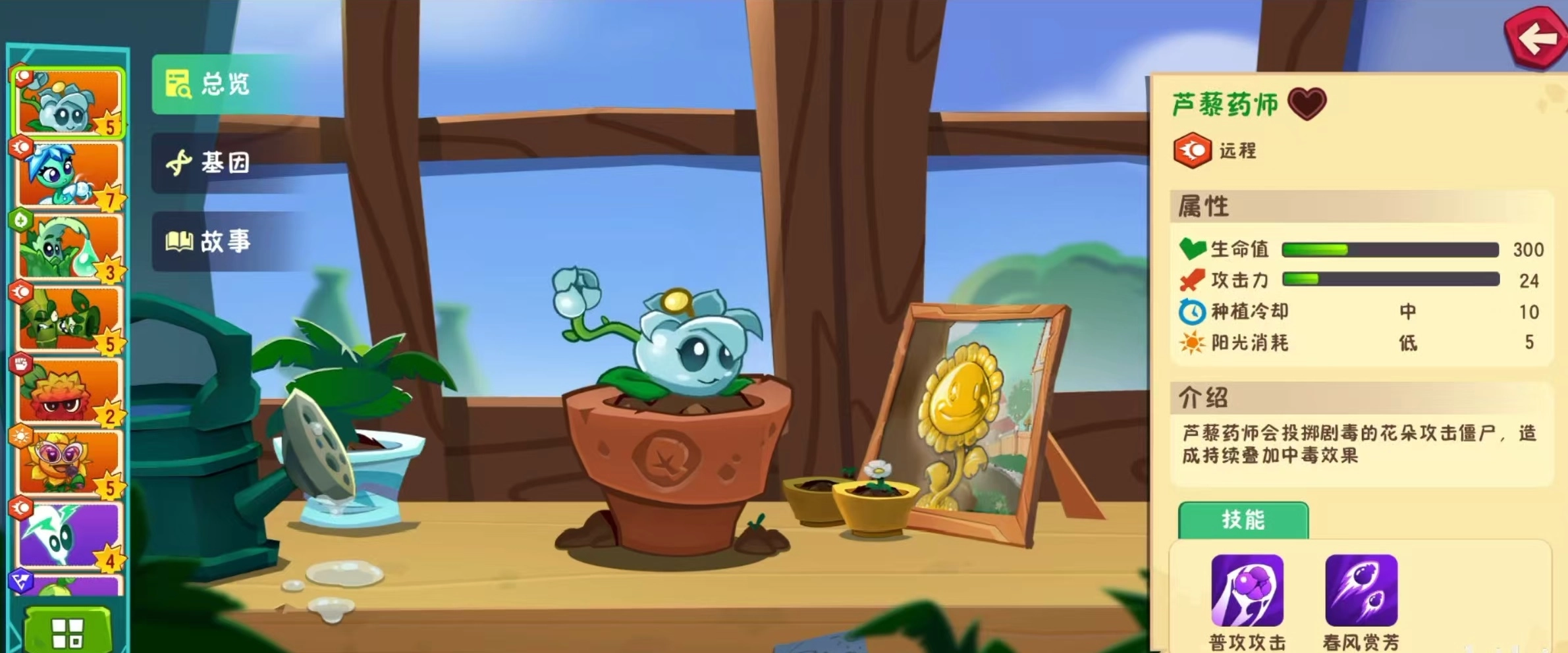 芦藜药师属于远程输出类型,生命值为300,攻击力24,种植冷却处于中等水平,阳光消耗较低,仅需5点阳光就能种植。芦藜药师能够投掷剧毒花朵攻击僵尸,可造成持续叠加的中毒效果。其拥有两个攻击技能,分别是普通攻击与春风赏芳。