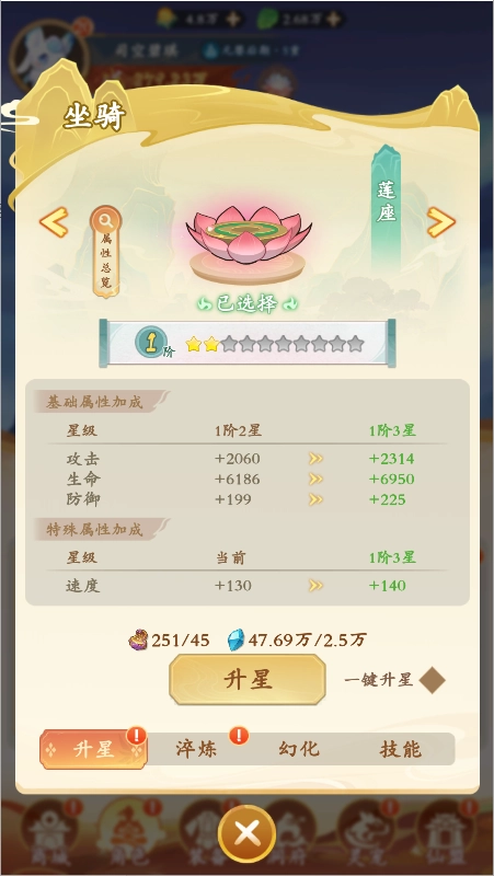 坐骑升星:通过消耗庚金与灵石,能够为坐骑升星,进而提升其基础属性。