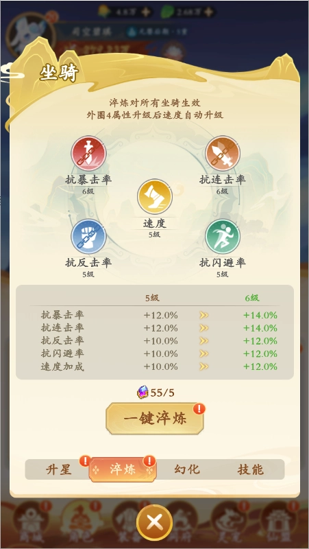 淬炼:通过消耗五彩石,能够对坐骑进行淬炼升级,从而提升坐骑的各项属性。