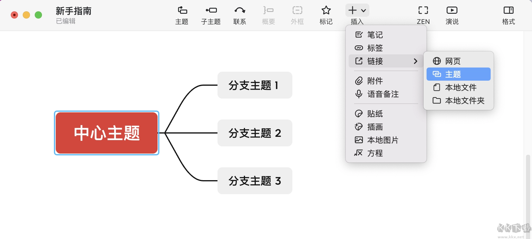 Xmind允许在主题里插入与内容相关的链接,其中涵盖网页链接、主题链接以及本地文件链接。