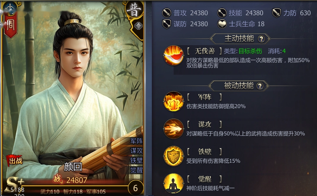 技能效果:针对敌方谋略数值最低的部队,发动一次强力攻击,此次攻击额外附带50%的双倍暴击伤害。