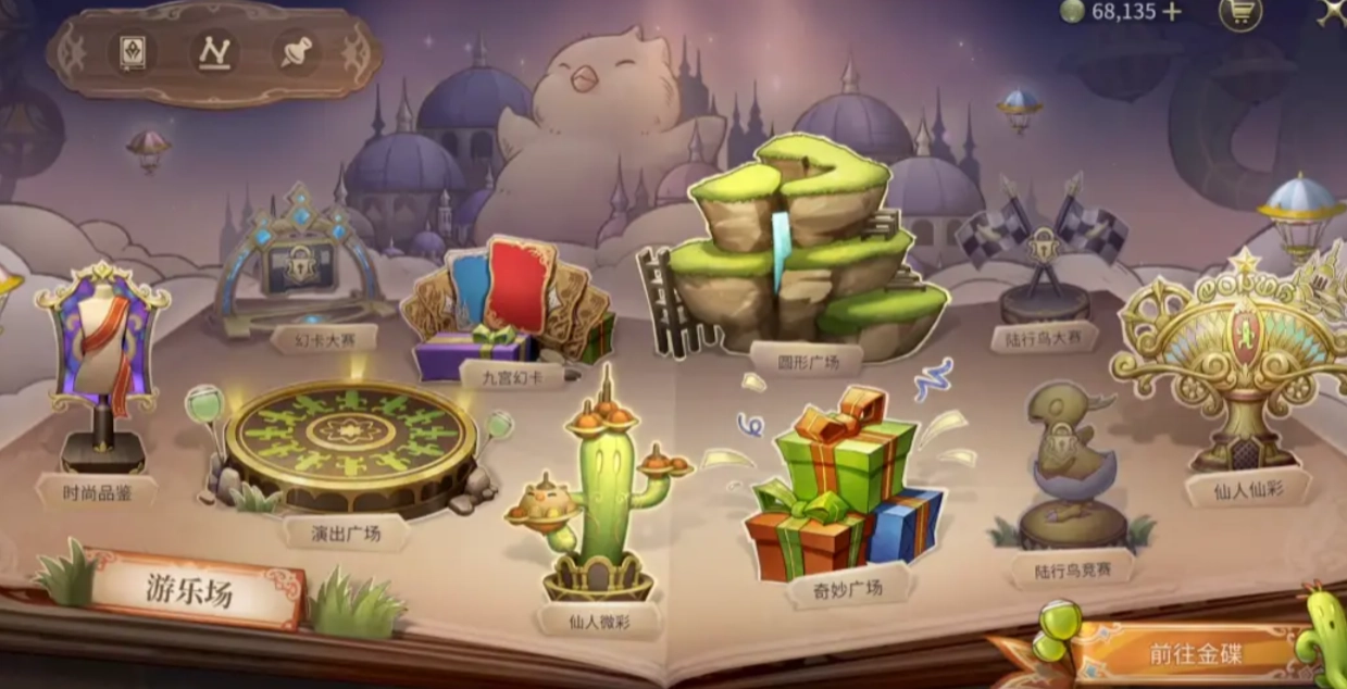 金蝶游乐场共计五个游玩项目,具体为陆行鸟竞赛、刮刮乐、街机小游戏、怪物投篮以及莫古抓球机。