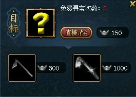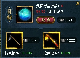 若道友未能直接获取对应道具奖励,却找到了宝物所在之处,那么可以使用价值300金元宝的“锄头”或者1000金元宝的“锄头”进行挖掘,直至得到奖励(提示:每一次挖掘都会显示出挖到宝物的概率)。