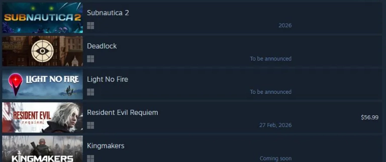随着公布后的讨论热度不断攀升,《生化危机:安魂曲》成功跻身Steam平台愿望单榜单前五,目前位居第四,排在其前面的依次是《深海迷航2》《死锁》(《Deadlock》)与《无火之光》。而位列第五的则是备受瞩目的中世纪策略射击游戏《Kingmakers》。