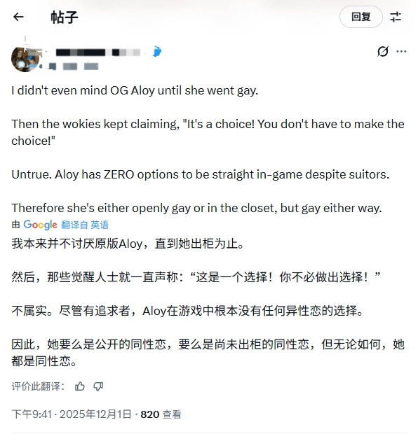 我原本对原版埃洛伊没什么意见,直到她被设定为同性恋,而且游戏里完全没有让她选择异性恋的选项,所以不管她有没有公开,本质上都是同性恋。