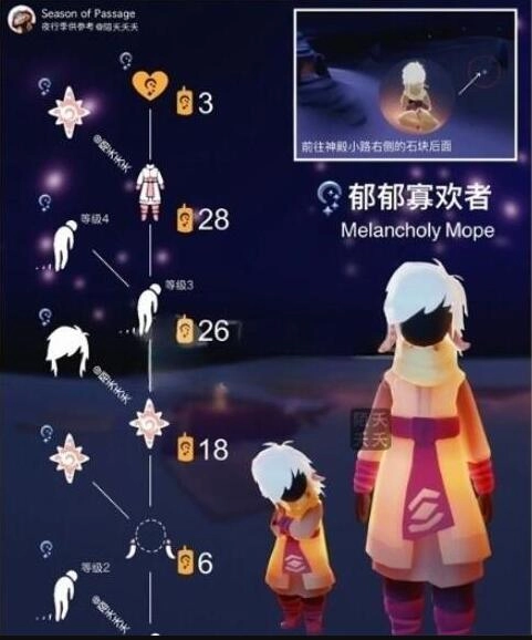《光遇》夜行季里有位让人印象深刻的先祖——郁郁寡欢者,他垂头丧气、丧尸般的走路姿势极具辨识度,不少玩家调侃这简直是当代年轻人精神状态的真实写照,又丧又萌的反差感圈粉无数,很多人都想兑换他的物品。别看他模样颓丧,能兑换的道具可不少:黄紫配色的棉裤、斜刘海发型、精致的象牙耳坠,还有那自带戏感的“垂头丧气”动作都很值得入手。想知道这位忧郁自艾者的位置?快来一探究竟吧!