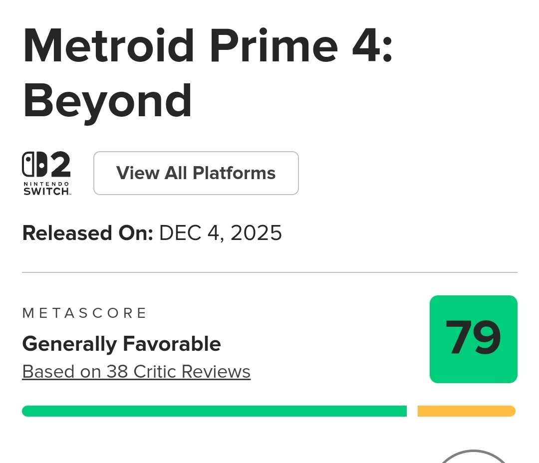 在评分汇总网站Metacritic上,《银河战士Prime 4:超越未知》目前在64家媒体评测后仅获得了81/100的综合评分。