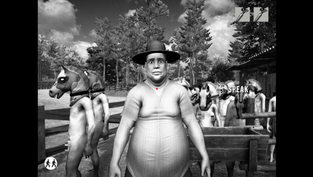 游戏采用黑白画面、字幕卡对白、真人片段与3D动画交织的呈现形式,搭配极简声效,构建出极具压迫感的氛围。玩家每日需依照任务清单,完成喂食、砍柴、清理马厩等事务,并在开放的小型场景里,与法多(Fido)这类NPC展开互动。在此过程中,玩家还会遇到农场周边的几位“本地人”,像兽医、商人、神职人员等,这些角色在叙事里承担着与农场主行为体系相关联的功能。