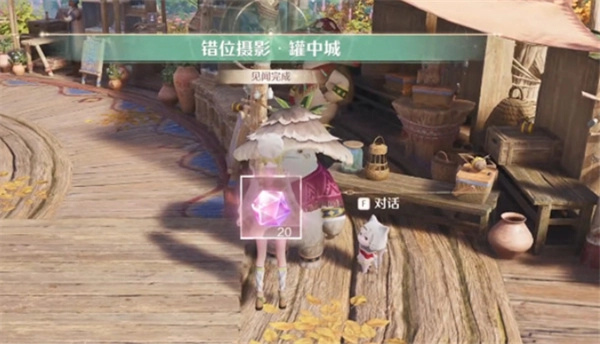 2、沿着道路往前走,进入任务图标所指的空地,在目标地点找到NPC艾拉姆姆,和他对话就能接取错位摄影任务“罐中城”。