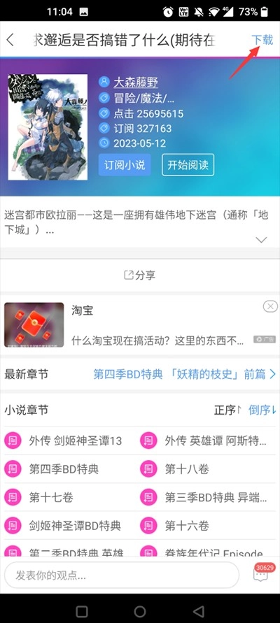 2、在小说详情页面,点击右上角的下载按钮。