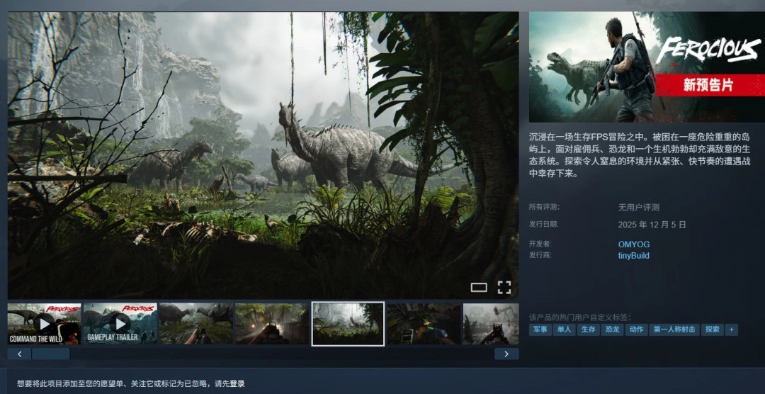 开发商OMYOG与发行商tinyBuild共同宣布,以恐龙为题材的第一人称射击游戏《蛮荒计划 (FEROCIOUS)》确定于12月5日正式发售,届时将登陆PC平台的Steam商店,且游戏内将提供简体中文支持。