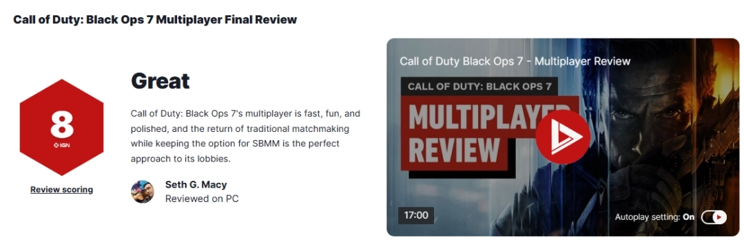 目前IGN给该游戏的多人模式打出了8分的好评,评价道:《使命召唤:黑色行动7》的多人模式节奏轻快、乐趣丰富且制作精良,在保留技术匹配选项的基础上重新采用传统匹配机制,为玩家大厅问题找到了最理想的解决办法。