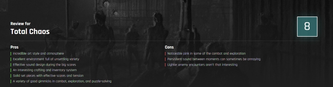 《Total Chaos》于我而言是部满含极致反差的作品。我格外认可它的战斗与生存机制设定,可实际和普通敌人近身搏斗、持枪交火时,体验感却没能达到心里的预期。游戏里存在的一些明显粗糙之处,也弱化了那些优秀设计的感染力。不过,游戏的场景搭建、环境氛围营造以及音效设计,却一直让我深深着迷。尤其是那些规模更大的恐怖桥段,还有它们层层递进的铺垫,做得格外出色。像这样从《Turbo Overkill》到《Total Chaos》完成主题大转变的游戏并不常见,但我觉得Trigger Happy Interactive确实通过这部作品,打造出了一款相当有意思的游戏。它或许表现不够稳定,但当《Total Chaos》真正展现出实力时,那种冲击力就像一柄重锤,狠狠敲打着我们已然扭曲混乱的理智。
