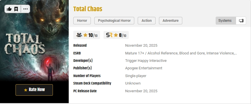 曾打造《涡轮杀戮》的Trigger Happy Interactive工作室,近期推出了他们的首款生存恐怖游戏《Total Chaos》(全面混沌)。这款新作已于2025年11月20日正式登陆XSX|S和Steam平台,并且首发即加入XGP阵容,Steam国区的首发特惠价格为78.2元。