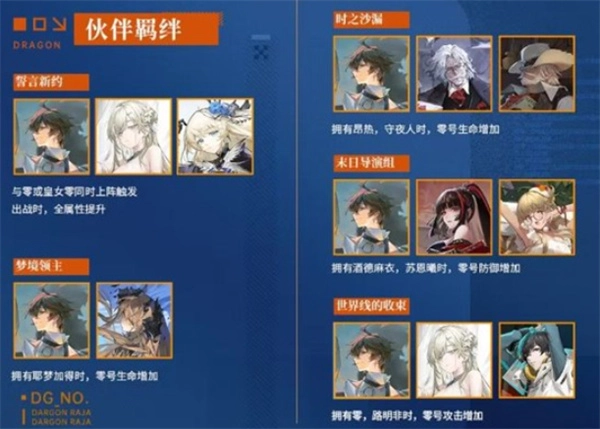 羁绊多属于生命、防御或团队增益类型,能进一步提升零号的前排价值。