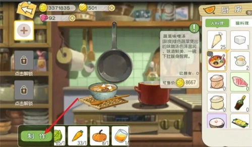 4、学会像图中所示的方法制作菜品后,返回厨房,点击右侧的【烹饪】按钮。