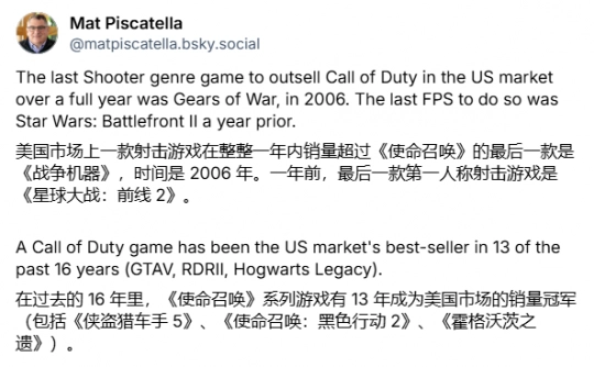 根据Circana分析师Mat Piscatella披露的最新数据,《使命召唤》系列在美国游戏市场的统治力令人惊叹。数据表明,上一款在销量上超过《使命召唤》作品的射击游戏,要回溯到2006年——当时Xbox 360平台发售的《战争机器》初代,击败了同期推出的《使命召唤3》。至于上一次有第一人称射击游戏战胜《使命召唤》,时间则更为遥远,是2005年与《使命召唤2》同期竞争的《星球大战:前线2》。