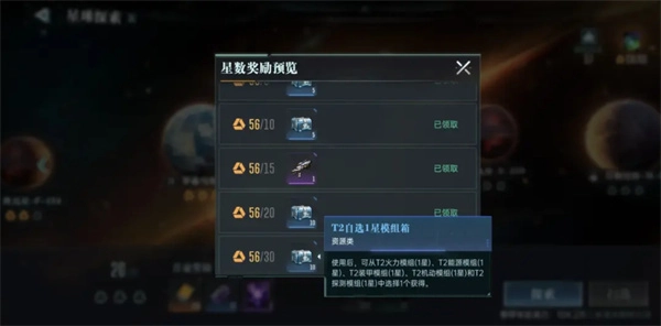 3. 关于群星纪元模组箱获取的攻略若玩家期望获取模组箱,可选择进行星球探索。当玩家在星球探索中的等级升至30星时,便能领取30个T2级别的模组箱。