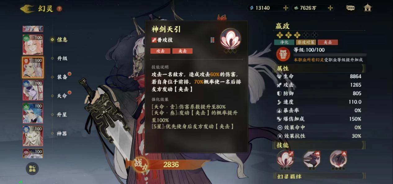2. 嬴政(坚实壁垒&夹击引擎):5星 + 天命叁,此时【夹击】概率达到100%,这是整个阵容能够流畅运转的关键因素,能够显著增加后羿以及其他队友的输出机会。