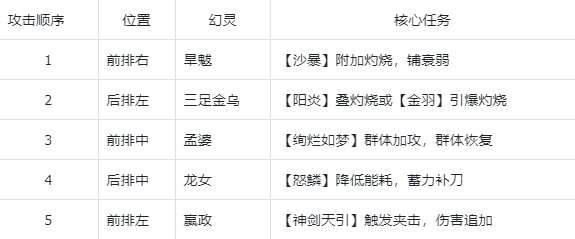 旱魃率先出手,消除敌方的增益状态,同时施加衰弱与灼烧效果,削减敌方的效果抵抗能力,为金乌后续的引爆创造有利条件。