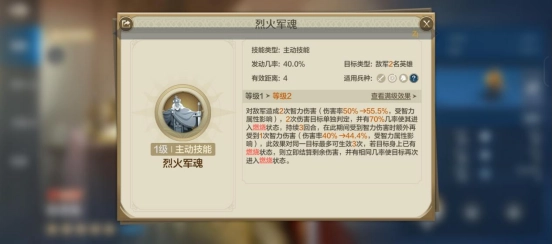 其核心自带技能“烈火军魂”效果为: