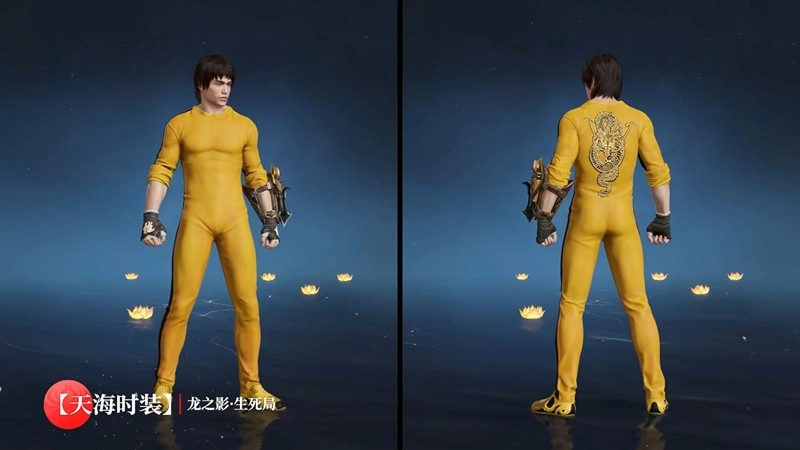 天海 - 龙之影·生死局:身着经典的黄色练功服,其背后绣有大面积的中国龙图案,这与拳套上的“龍”字相互呼应。