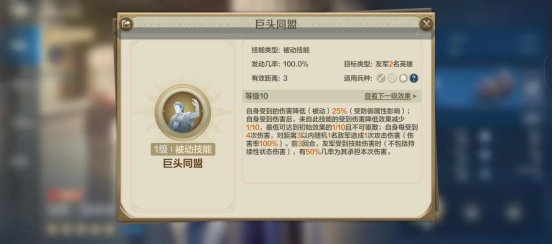 同盟契约:自带技能自身受到的伤害降低效果最低降到初始效果的2/10