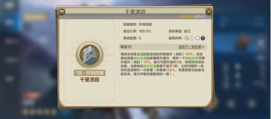 千里溃敌:造成的伤害无视目标(战前)10%防御、智力属性