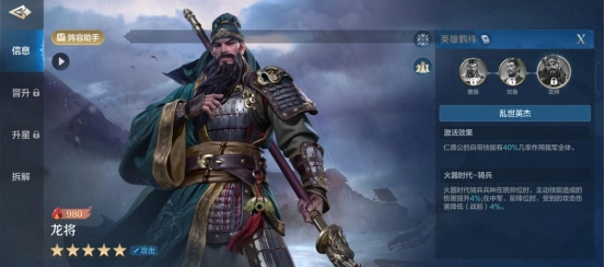 龙将的攻击距离为4,率领的是骑兵,定位是输出,面板是标准的输出英雄,在攻击属性是顶级水准之外,防御和敏捷也不算低。