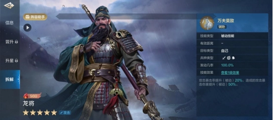 在技能搭配方面,强烈建议龙将携带具有伤害性的主动技能,像“箭雨流星”“战无不克”这类。可以不用考虑那些“需要准备1回合”的技能,原因在于龙将自身每回合都能获得自有Buff,而且队友也会为其提供Buff,所以保证每回合都有伤害输出的频率更为关键。