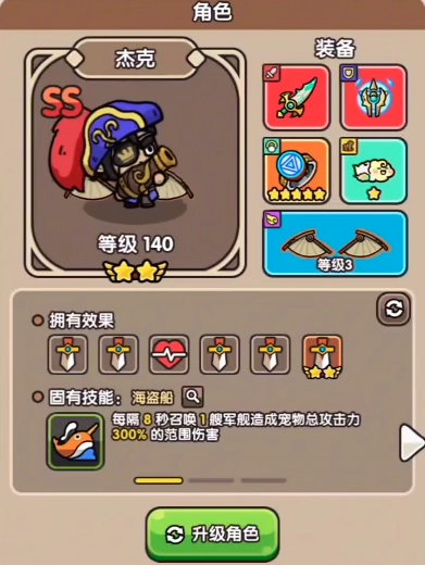 游戏中有着众多的英雄角色,而首推的便是杰克。杰克这个英雄具备召唤军舰的能力,所召唤出的军舰能造成等同于宠物总攻击力300%的伤害。当该英雄升级后,其能力会愈发卓越。在战斗过程中,还可凭借自身技能使对手陷入眩晕状态。对于技术型玩家而言,不妨优先选用这个角色投入战斗。随着后期对角色培养,当星级提升至二星及以上时,角色的战斗力将会更上一层楼。