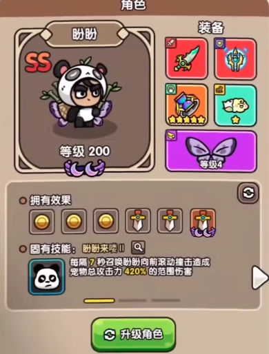 要是玩家想拥有一个具备闪避或护盾特性的角色,盼盼会是个不错的选择。盼盼的外形十分可爱,是一只大熊猫。每隔7秒,就能直接召唤该角色向前滚动,滚动时角色会直接撞击对手,通过这种方式,可造成等同于所有宠物攻击力420%的范围伤害。它非常适合用于竞技场,而且升级后,盼盼还拥有较高的闪避能力。