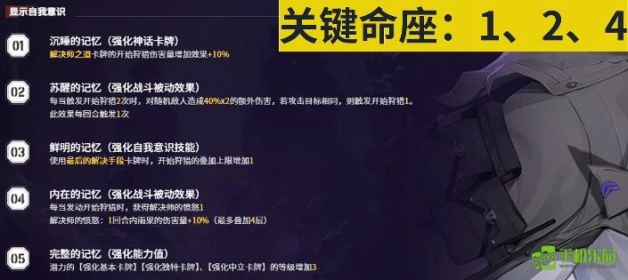 0命和2命的小春在操作手感上差异明显,就连相对冷门的路克也是如此。这类大幅提升角色能力的命座,我们称之为关键命座。它们的提升方式大致可分为四类:第一类是强化自身的神化卡牌;第二类占比最多,主要是强化战斗被动卡牌的效果,这其中还包含了机制层面的拆分;第三类是对自我意识技能(即需要消耗能量的大招)的强化;第四类则是提升能力值,这类相对不那么关键——目前所有角色的五命都是强化能力值,因此大家判断关键命座时,应重点关注那些强化战斗被动效果的类型。