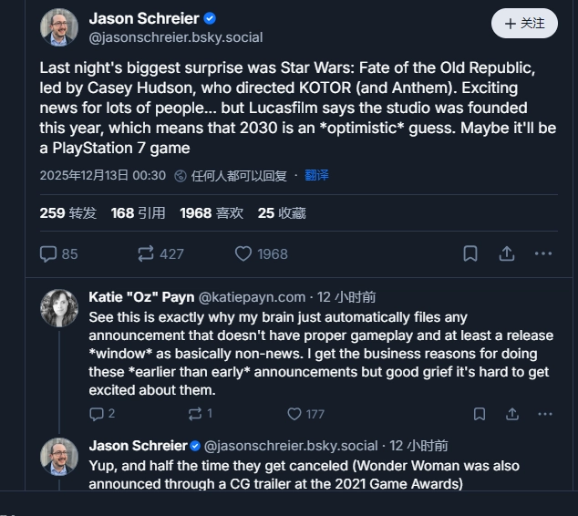 在昨天举办的TGA大会上,备受玩家期待的《星战:旧共和国命运》公布了全新预告,瞬间点燃了广大粉丝的热情。不过很快有网友提出质疑,称有传闻表示这款作品无法在2030年之前推出。对此,开发工作室Arcanaut Studios的CEO杰森·舒雷尔第一时间作出回应,明确表示该传闻毫无根据,完全不可信。