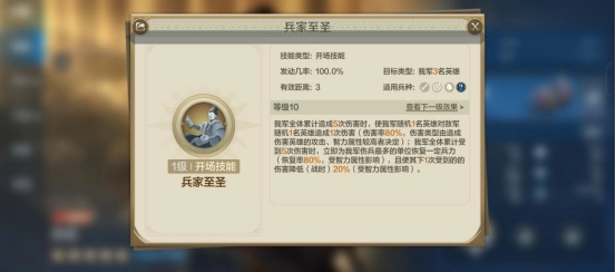 当我方军队全体累计遭受5次伤害时,即刻让我方伤兵数量最多的单位恢复一定兵力(伤害率为40%【达到满级时为80%】,该恢复效果受智力属性影响),同时使其下一次在战时受到的伤害降低10%(满级时降低20%)(此减伤效果同样受智力属性影响)。