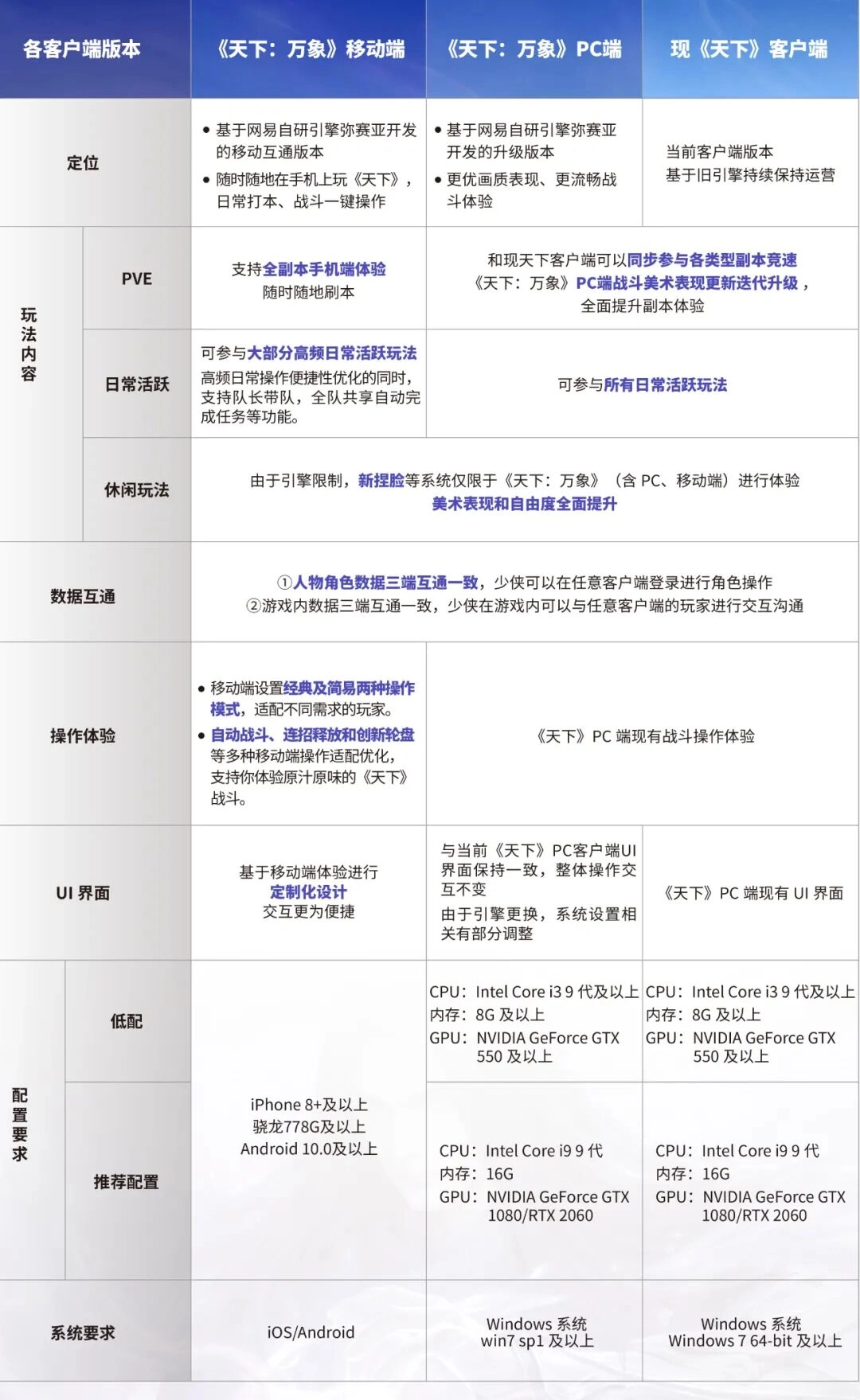 即便你用配置较低的“千元机”,也能流畅运行《天下:万象》。不过,目前的移动端版本暂时无法体验端游的全部玩法,大家可以在公测后,可以参考下方表格了解移动端和端游玩法的具体差异。