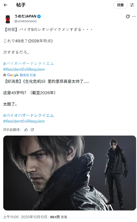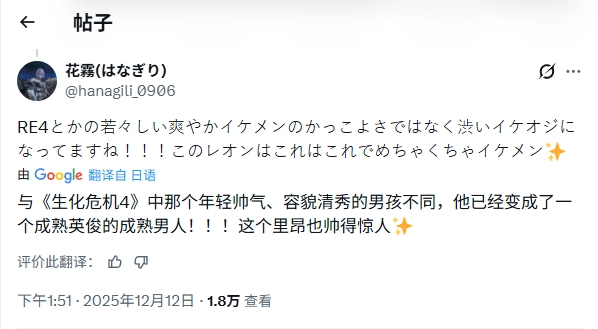 里昂的回归此前已在玩家群体中引发多种猜测,但其正式亮相及全新角色造型仍引发广泛讨论。在日本玩家社区里,里昂接近50岁的设定与形象更新受到关注,不少玩家称其为“有魅力的中老年男性”。部分玩家表示,里昂确认登场提升了他们对本作的兴趣,甚至影响了购买意愿。