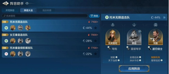 鉴于托米丽司属于追击体系,首先推荐拥有追击神技辅助的“维多利亚”与之搭配,接着搭配控制法核秦始皇,从而组建出“托米丽司+秦始皇+维多利亚”这样的控制追击队伍,实现控制与输出的兼顾。