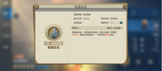 效果:进行普通攻击后,会对目标额外造成1次基于智力的伤害(伤害率为210%,该伤害受智力属性影响),同时回复我军2名英雄一定量的兵力(恢复率135%,恢复效果受智力属性影响)。