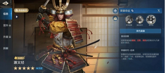 源义经的命运羁绊是与真田幸村、宫本武藏同出场会触发“末代英雄”,效果如下: