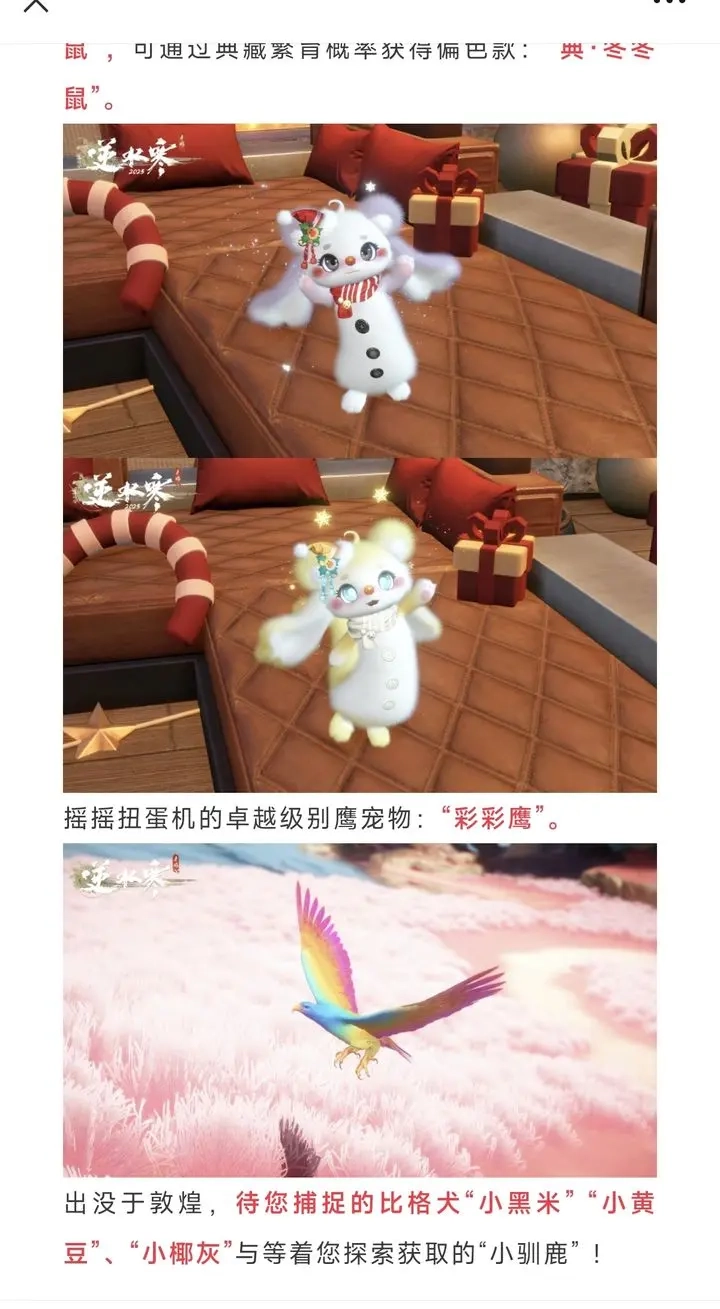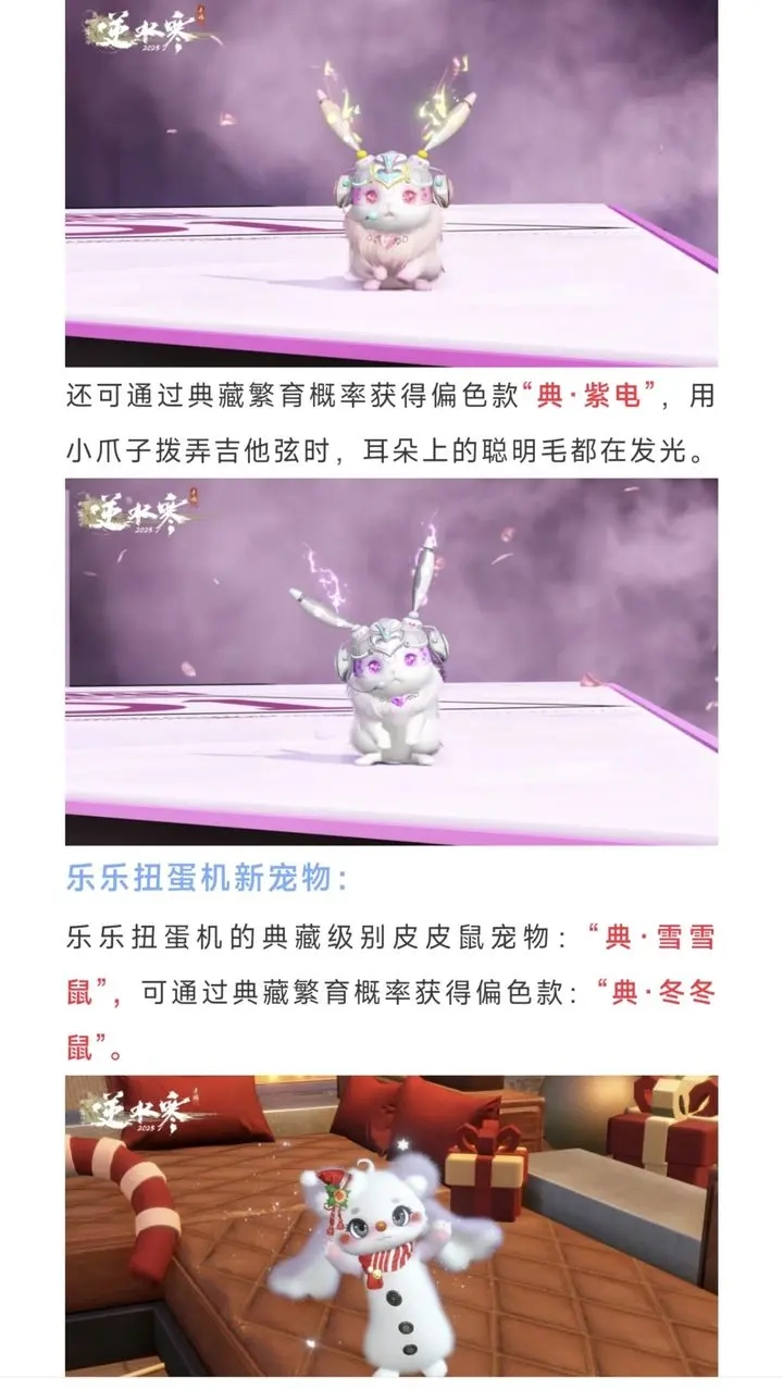 乐乐扭蛋机即将新增典藏品质的皮皮鼠宠物“典·雪雪鼠”,它的偏色版本是“典·冬冬鼠”。而摇摇扭蛋机将更新卓越品质的鹰类宠物“彩彩鹰”。这些新宠物让玩家拥有了更丰富的收集选择。