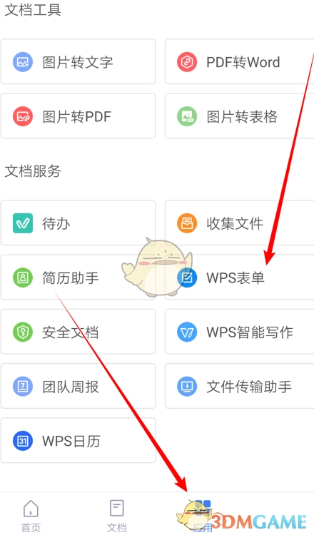 1. 打开软件后,选中“应用”,进而进入“WPS表单”。