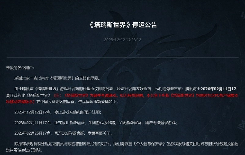 腾讯旗下MMORPG《塔瑞斯世界》在国际服停服之后,国服也发布公告称将于2026年2月11日终止运营,并且从2025年12月12日开始就会停止游戏充值服务以及新用户注册通道。这款游戏是在2024年6月12日开启公测的,整体运营时间还不到一年半。