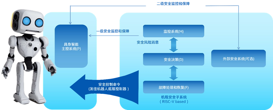 另外,《白皮书》还引入了PMDF安全架构,其目的是对风险进行系统性管理,保证机器人系统在各类复杂场景下都能安全运行。这一架构依据功能,把具备安全功能的机器人系统划分成四个在逻辑上相互独立的模块,即具身智能主控系统(P)、监控系统(M)、安全决策(D)以及故障处理和恢复(F)。其中M、D、F三个模块共同构成一个安全子系统,该子系统能够借助RISC-V等独立硬件来实现,这样既可以确保较高的安全性,又能直接部署在机器人本体上。各个模块之间相互配合、协同工作,一同构筑起稳固的安全屏障。